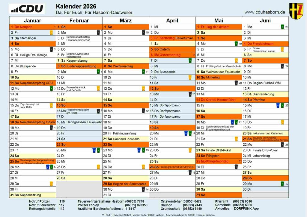 In den kommenden Tagen wird der Kalender 2026 an alle Haushalte in Hasborn-Dautweiler verteilt.Sollten darüber hinaus weitere Exemplare benötigt werden, steht unser Vorsitzender Michael Scholl gerne zur Verfügung. Wir wünschen Ihnen und Ihren Familien frohe und gesegnete Weihnachten und einen guten Start ins neue Jahr! Zum Download.